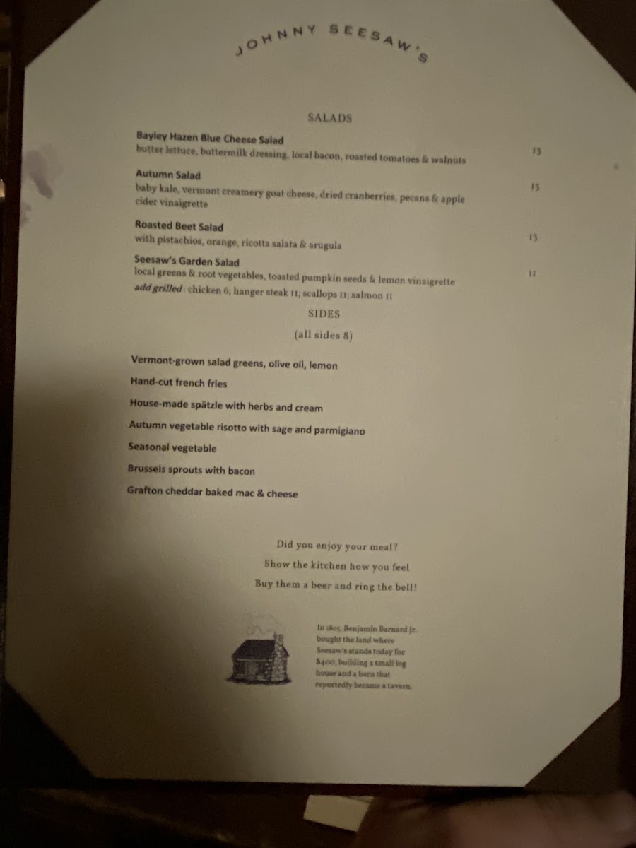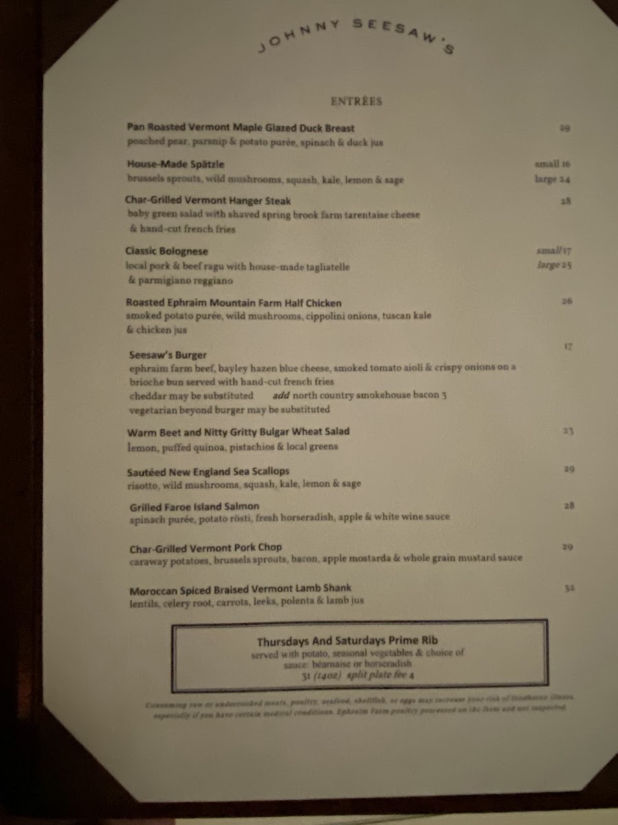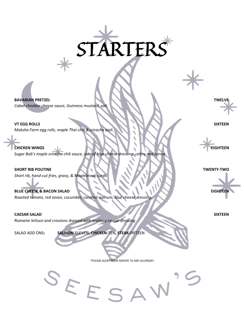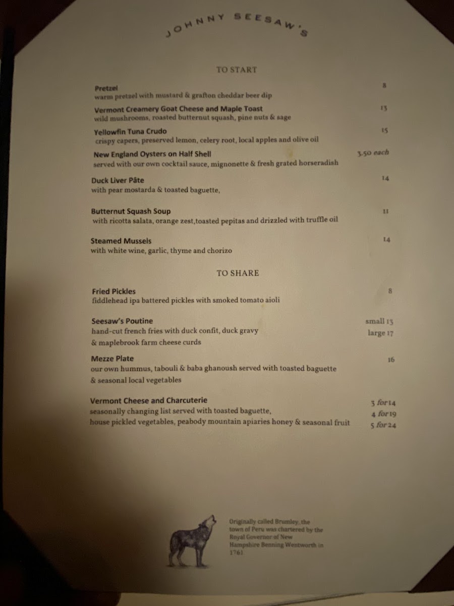 Introducing the menu at Johnny Seesaw's, located in the picturesque town of Peru, Vermont, is a culinary adventure that seamlessly blends rustic charm with indulgent flavors. The starters alone tempt the palate with items like the Bavarian Pretzel served with a creamy Cabot cheddar sauce and the flavorful VT Egg Rolls, perfectly paired with a spicy maple Thai chili aioli. For mains, the Woodlawn Farm Wagyu Burger steals the spotlight, showcasing premium beef adorned with fresh toppings and handcut fries. Not to be missed is the comforting North East Farm Beef Bolognese, a rich dish complemented by fresh fettuccine and creamy ricotta.